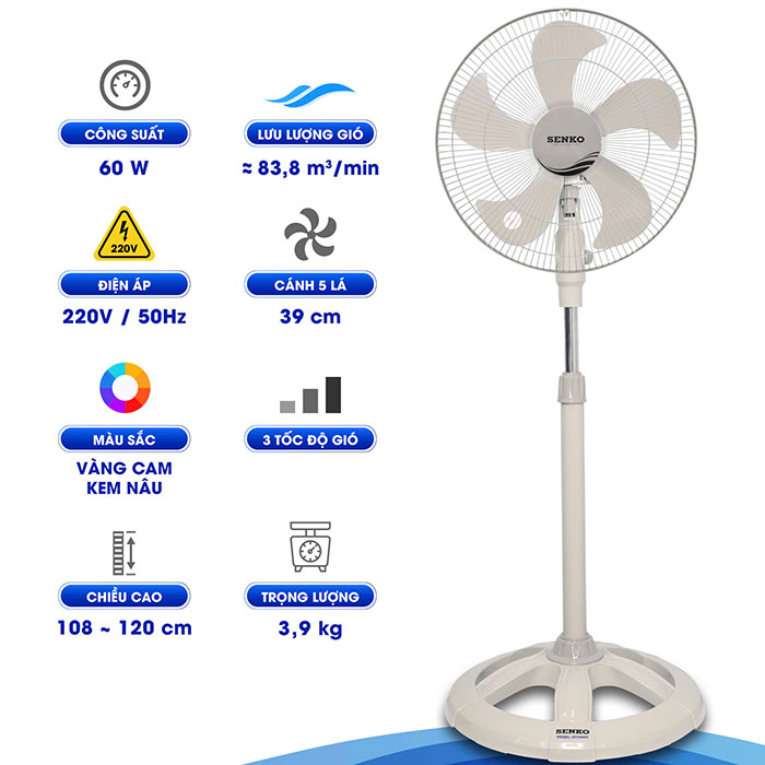 Quạt đứng Senko DTS1603 sải cánh 39 cm, công suất 60w phù hợp đặt tại mọi nơi trong nhà, vườn, sân, nhà hàng, quán ăn…